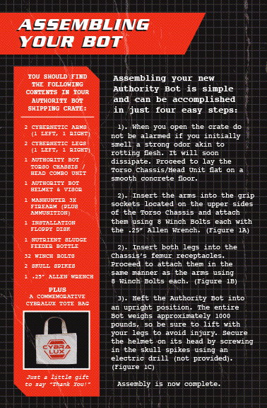 Learn the ins and outs of your brand new cybernetic law enforcement unit. This comprehensive manual details the assembly of your new unit as well as its capabilities, armaments, and care.
