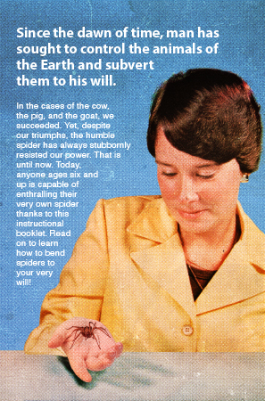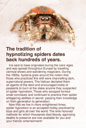 Catch all the facts and "how-to's" for how to bring total mental control over spiders! This volume from the Unruly Pet Club details the rich history of spider hypnotism as well as activities you can do with your new eight-legged friends!