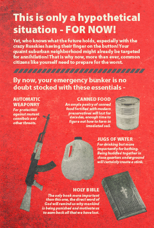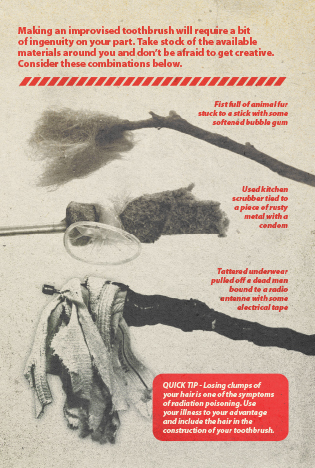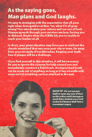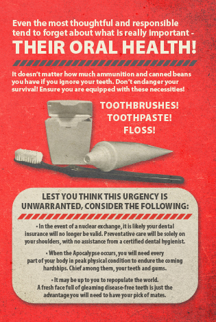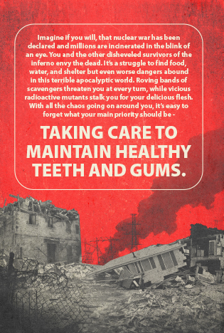 Imagine if you will, that nuclear war has been declared and millions are incinerated in the blink of an eye. You and the other disheveled survivors envy the dead. With all the chaos going on around you, it might be easy to forget what your main priority should be - TAKING CARE TO MAINTAIN HEALTHY TEETH AND GUMS! This vital booklet will provide the necessary tips you will need to maintain good oral hygiene when the ICBMs eventually fly.